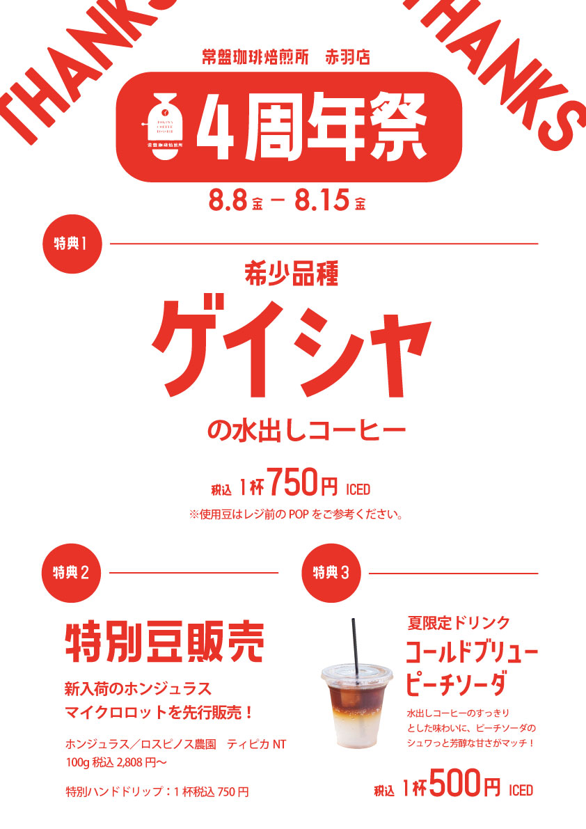 赤羽店4周年祭!8/8〜8/15|お知らせ|常盤珈琲焙煎所