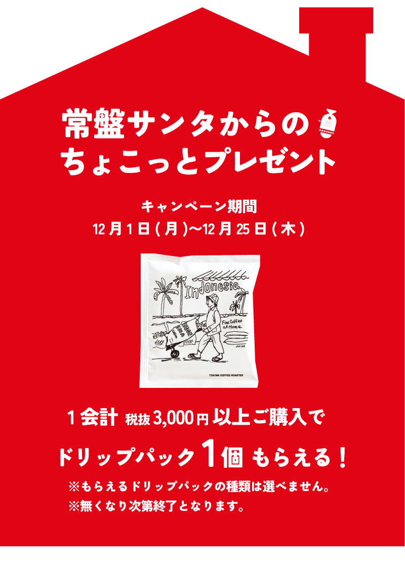 お知らせイベント ドリップパックがもらえる!常盤サンタからのちょこっとプレゼント! POSTED : 2025.12.01 ホリデー特別キャンペーン! 常盤サンタから、一年の感謝をこめてちょこっとプレゼント! 期間: 2025年12月1日〜12月25日 内容: 1会計税抜3,000円以上のご購入でドリップパック一つプレゼント! ※もらえるドリップパックの種類は選べません。 ※なくなり次第終了となります。 ※店頭限定です。
